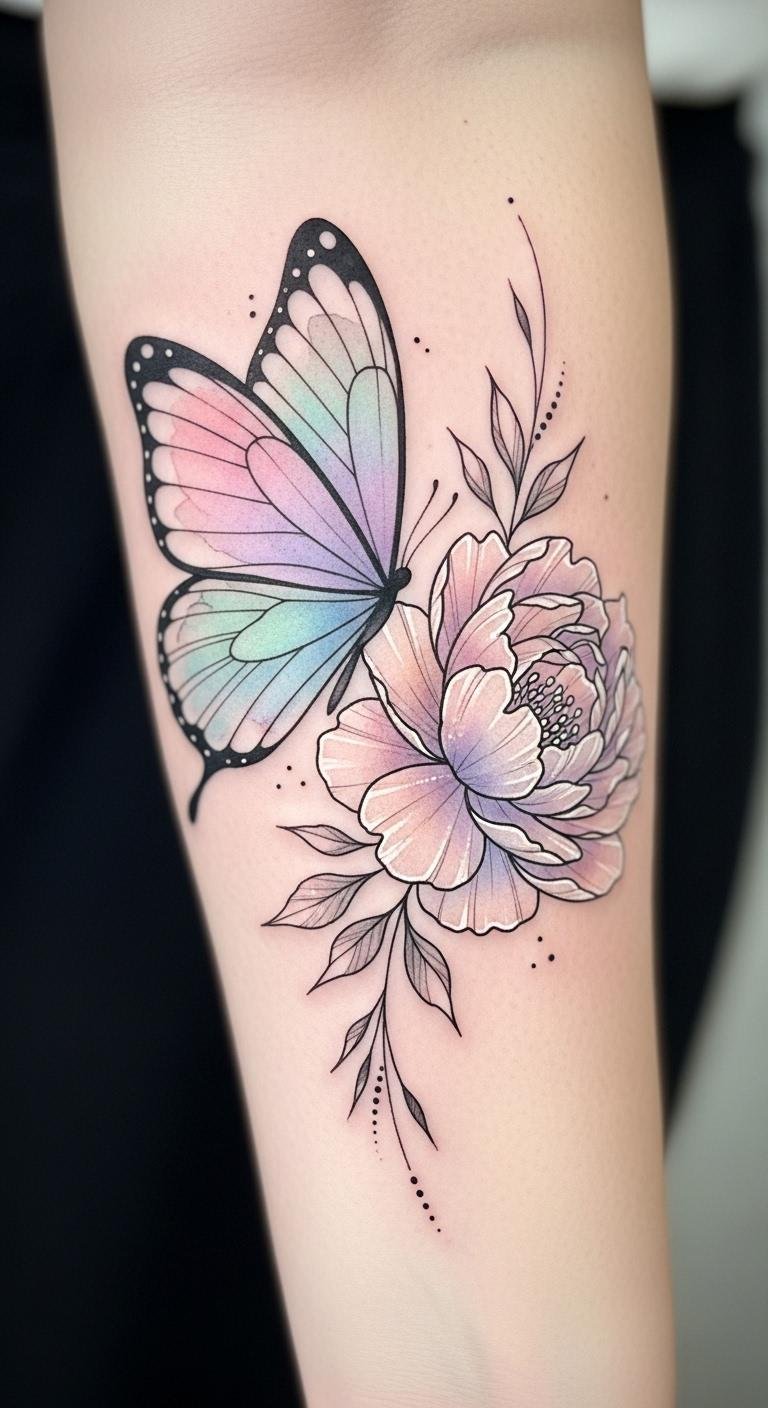 Building on the concept of contrasting elements, the soft pastel butterfly and peony tattoo offers a gentle yet vibrant representation of beauty and grace.