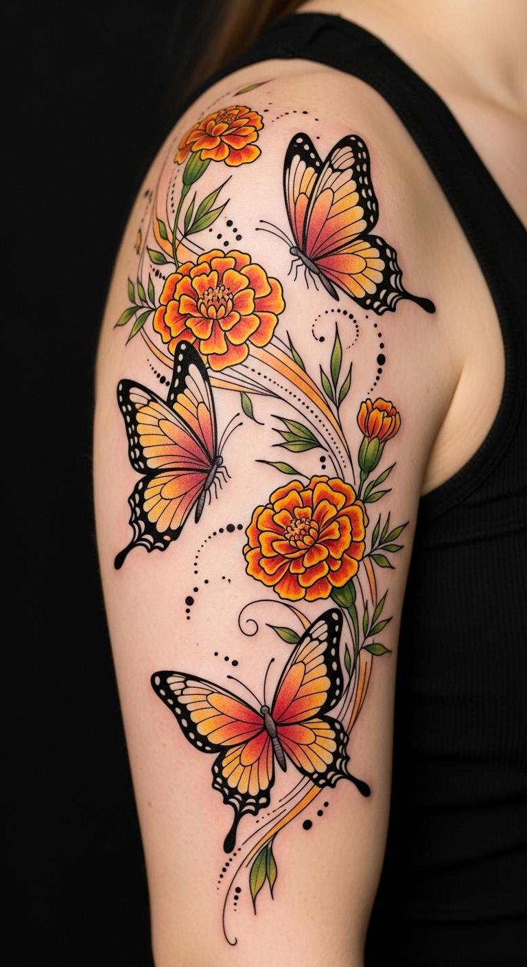 Place on the shoulder, forearm, or upper back where the flowing composition can follow muscle lines; the imagery evokes renewal and playful confidence, with the marigold and butterfly serving as reminders of personal creativity, resilience, and the freedom to grow.