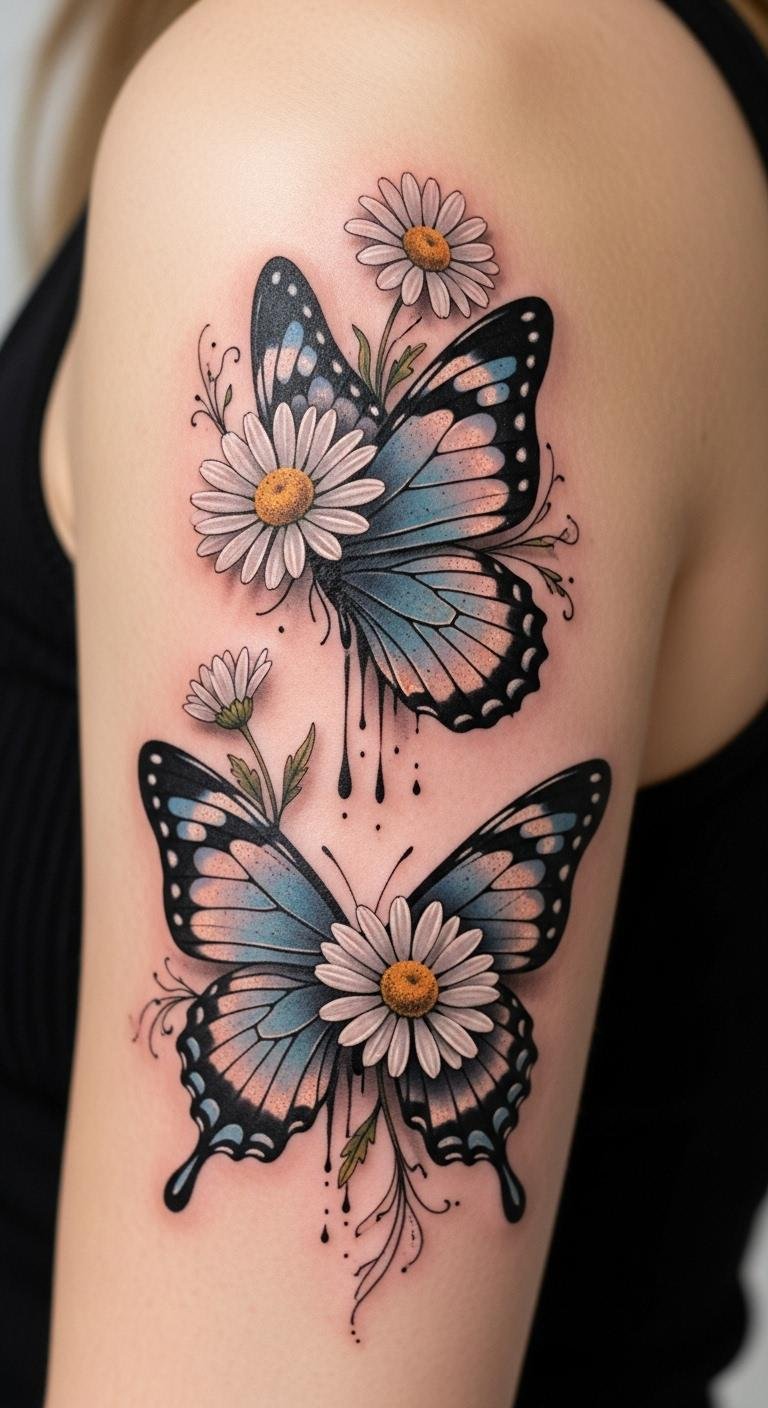 When placed along the shoulder blade or wrapping gently around the forearm, this design evokes renewal and gentle resilience; the daisies offer a soft, hopeful counterpoint to the dynamic motion of the wings, suggesting innocence carried forward by personal transformation.
