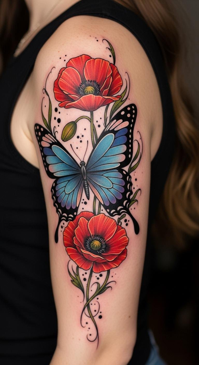 Imagine a custom butterfly design, its wings delicately intertwined with the poppy’s bold symbolism of resilience. Each color and detail can resonate with your spirit, embodying transformation and beauty—an inked representation of your unique story and freedom.
