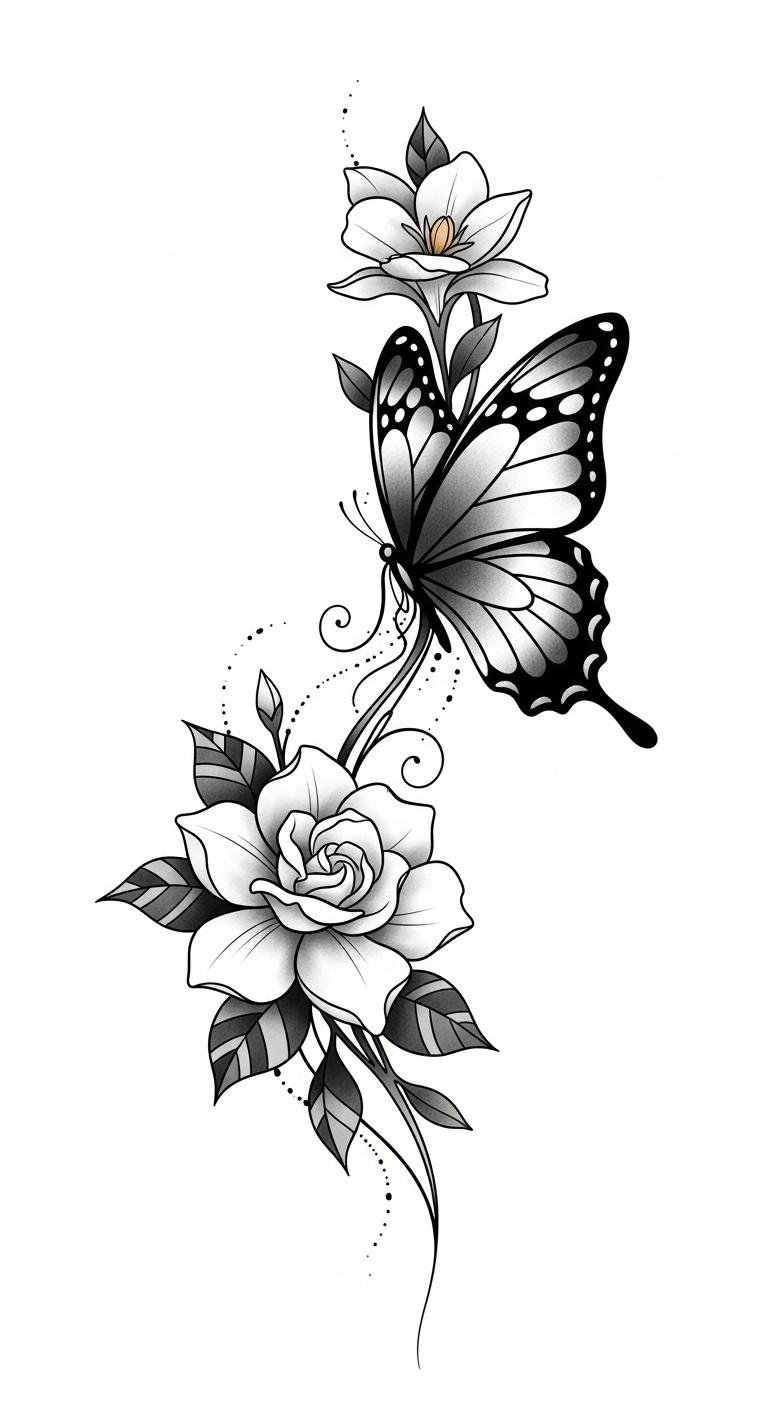 This design beautifully merges bold floral motifs with intricate ink techniques, showcasing the strength of the butterfly against the softness of the petals.