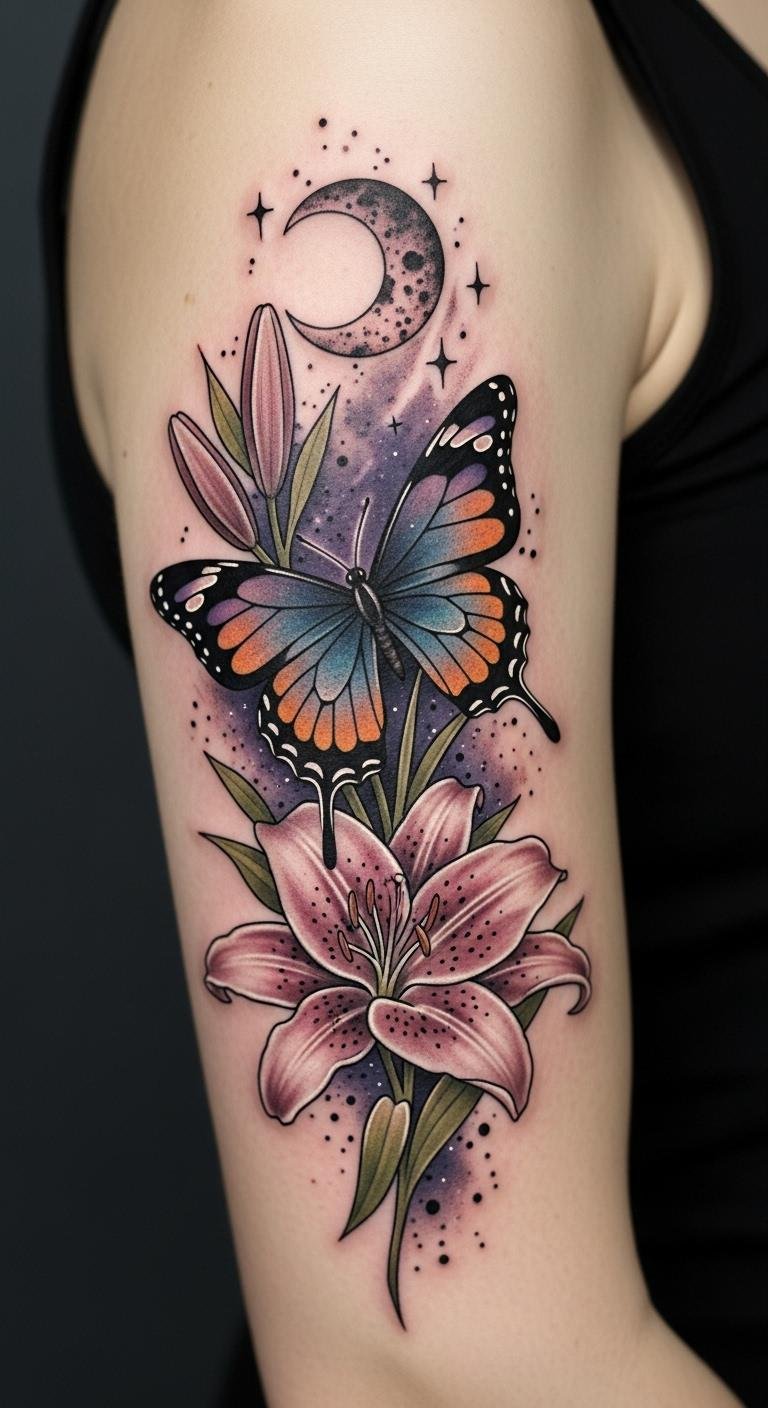 This design balances cosmic and earthly symbolism: the butterfly with star-dusted wings evokes transformation, freedom, and a connection to the night sky, while the stargazer lily brings purity, devotion, and passionate energy; together they create an emotional motif of renewal and awe.