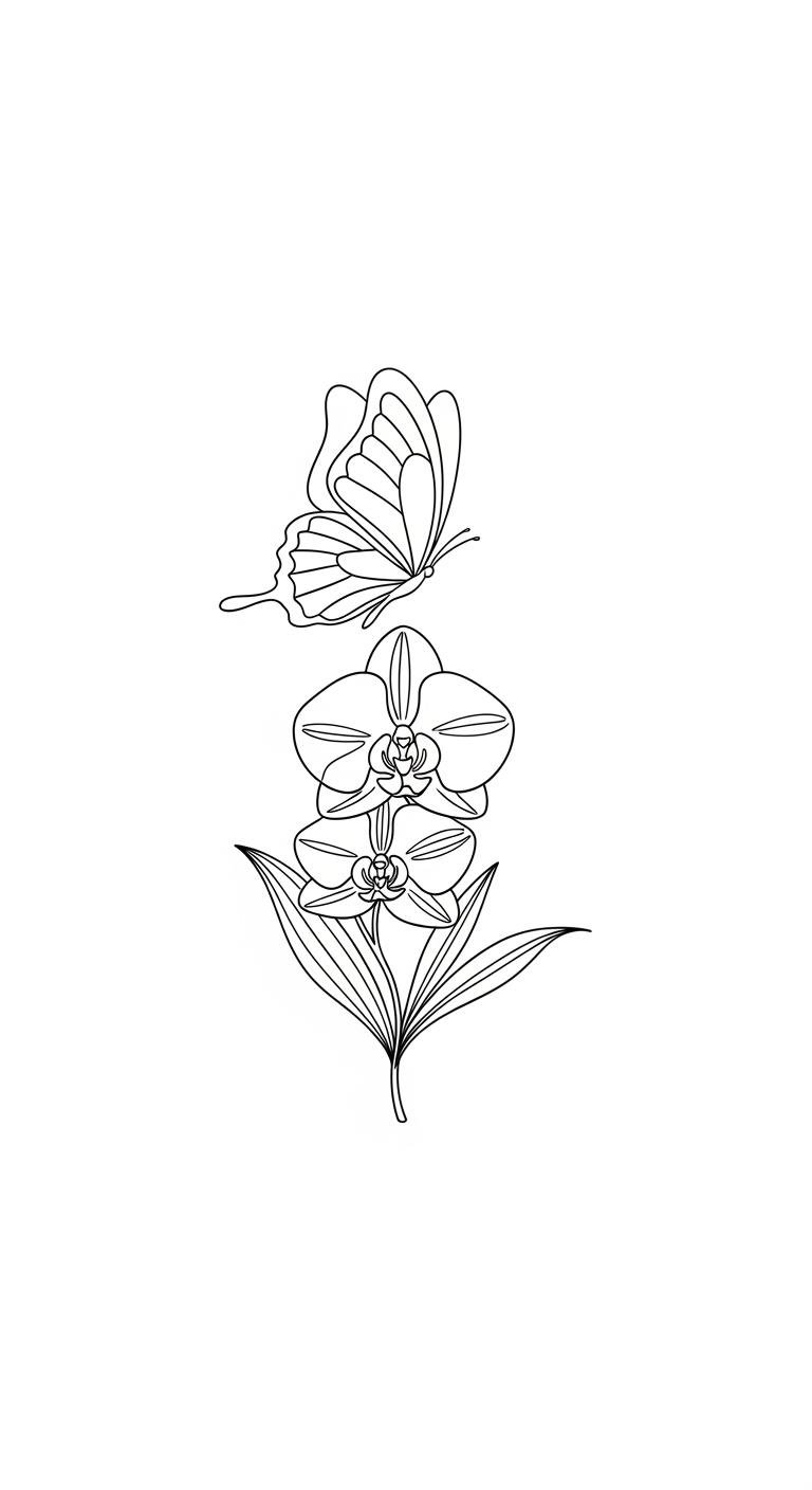 The tattoo pairs clean, flowing linework with negative space to evoke grace and quiet resilience; place along the collarbone, inside forearm, or on the ribcage so the butterfly’s wings appear to lift from the orchid, suggesting upward movement and personal growth.
