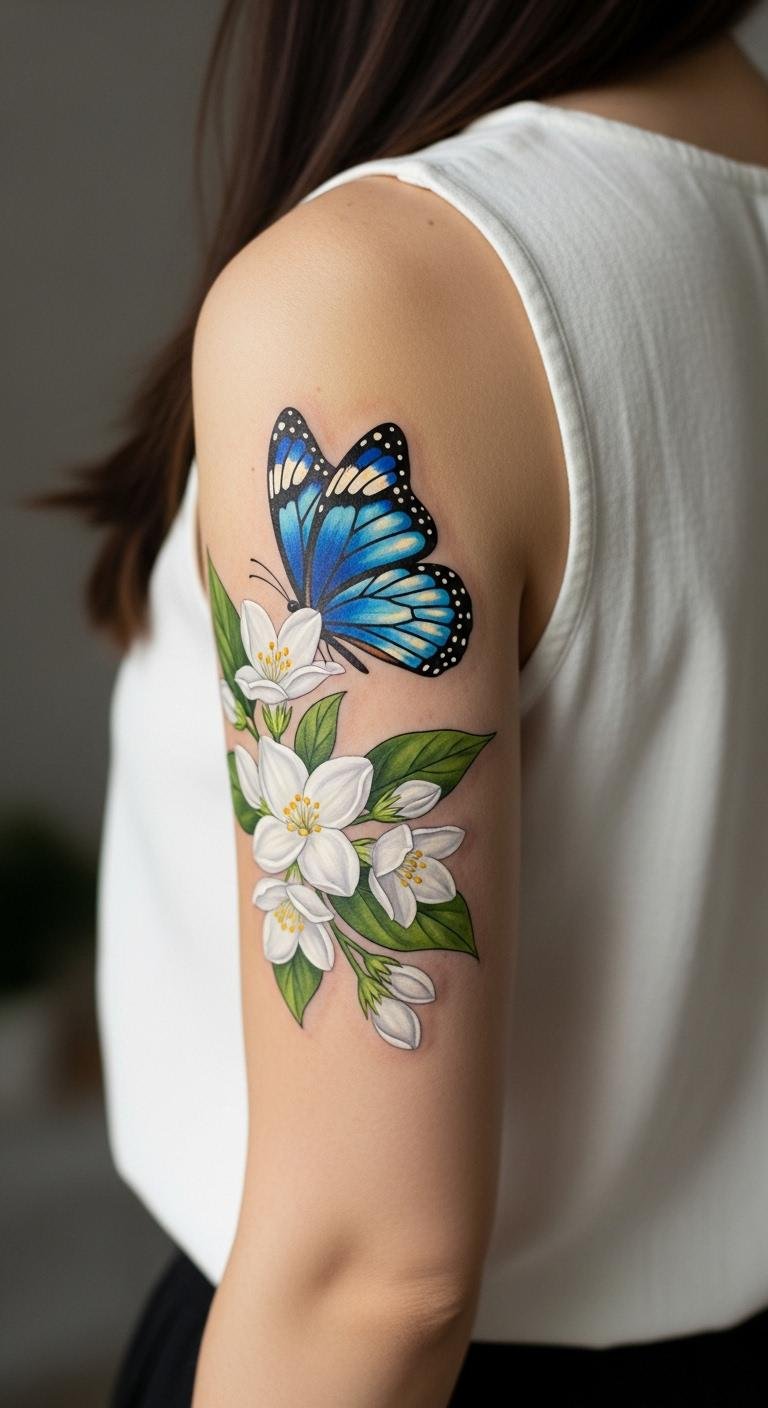This concept pairs the butterfly as a symbol of transformation and freedom with night-blooming jasmine to evoke mystery, sensuality, and renewal; cool moonlit tones and warm jasmine highlights create emotional contrast—tranquil introspection balanced by vibrant hope. Ideal placements are the upper arm for a personal, wraparound narrative or the back for a larger, evolving tableau; the composition can flow with natural contours, allowing the butterfly to appear mid-flight from bud to blossom, expressing personal growth and fragrant remembrance.