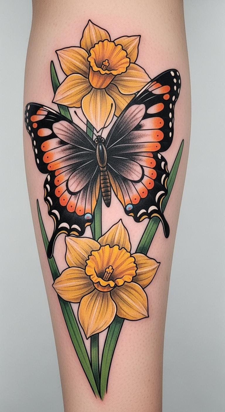 As you explore the striking combination of a neo-traditional butterfly and daffodil, you’ll find a design that bursts with color and character, enchanting the essence of both elements. This tattoo captures neo-traditional symbolism, blending the butterfly’s metamorphosis with the daffodil’s meanings of rebirth and new beginnings. It’s a vibrant reminder of growth, freedom, and the beauty of transformation in your personal journey. The imagery evokes optimism and resilience—bold lines and saturated hues convey confidence while soft gradients and delicate petals suggest tenderness; ideal placements include the upper arm, shoulder blade, or calf where the composition can flow with musculature and movement, allowing the butterfly to appear mid-flight among arching daffodil stems to symbolize ongoing personal evolution.