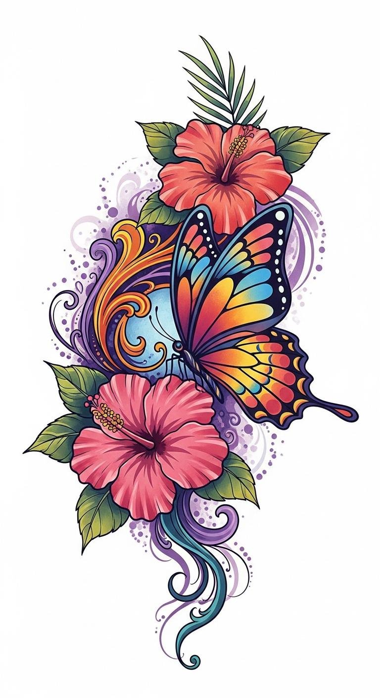 This design concept centers on transformation, resilience, and emotional vibrancy: the butterfly represents change and freedom, the hibiscus stands for beauty and resilience, and saturated, warm colors amplify joy and passion.
