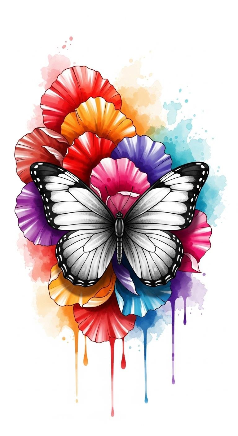 A stunning design option is the monochromatic butterfly paired with vibrant, colorful petals, creating a striking visual contrast that captivates the eye.