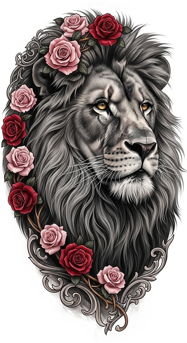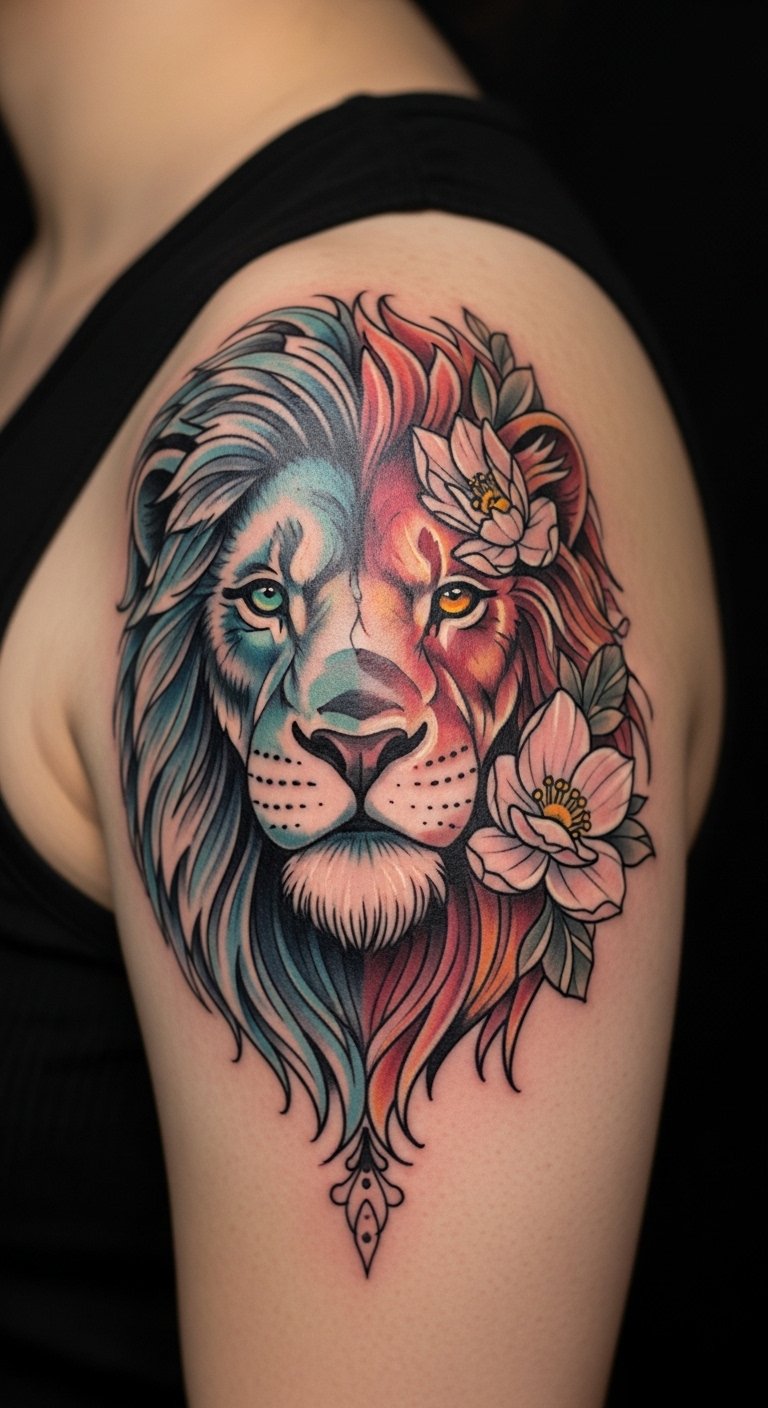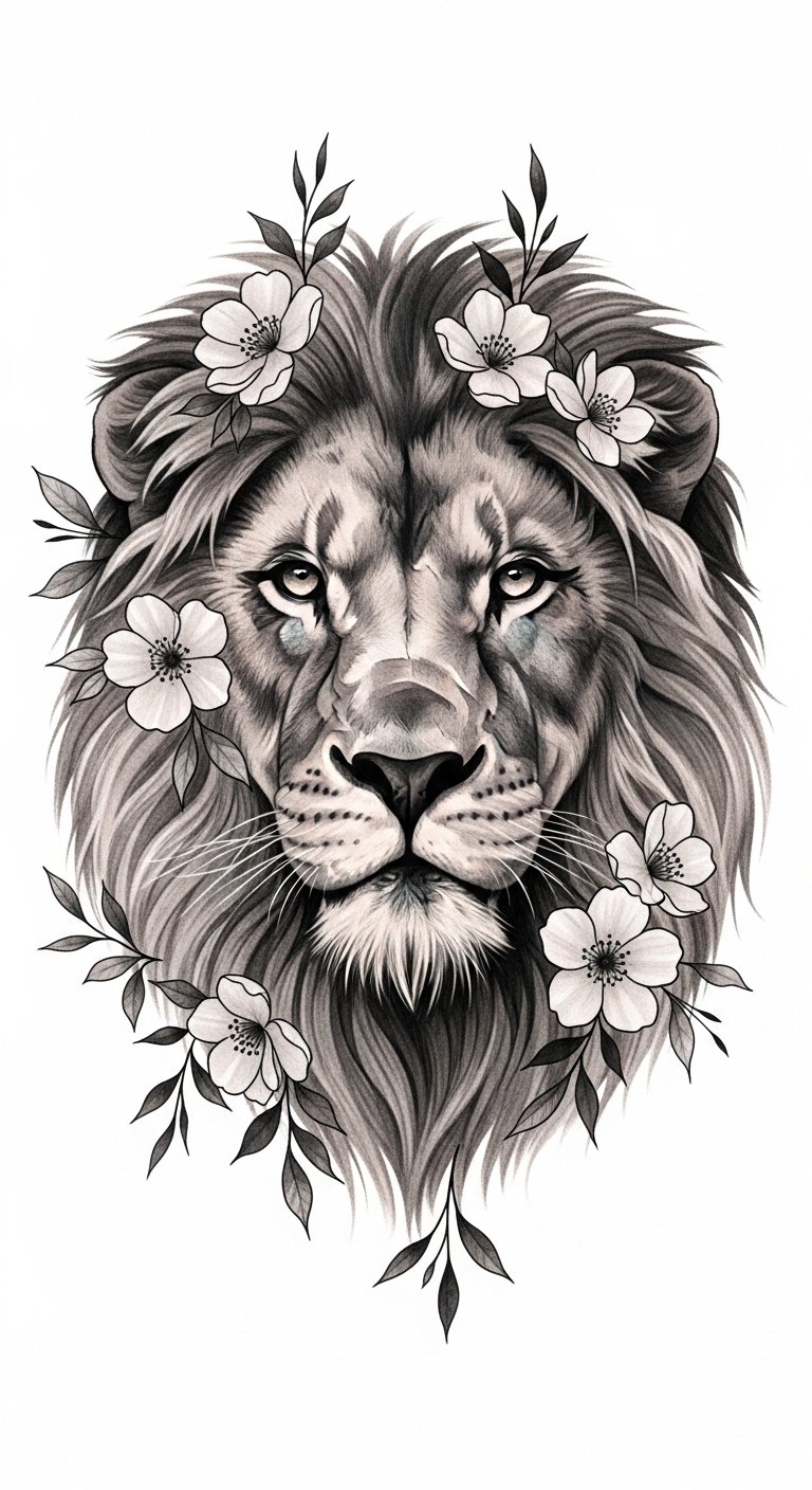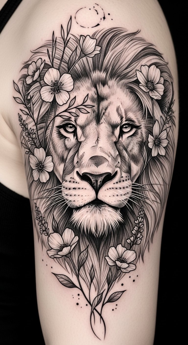 Symbolically this design balances courage and gentleness—strength tempered by vulnerability—and evokes liberation, inner resilience, and personal growth; ideal placement on the upper arm, shoulder, or across the chest so the lion’s gaze aligns with the wearer’s heart, allowing the flowers to cascade naturally with the body’s contours.
