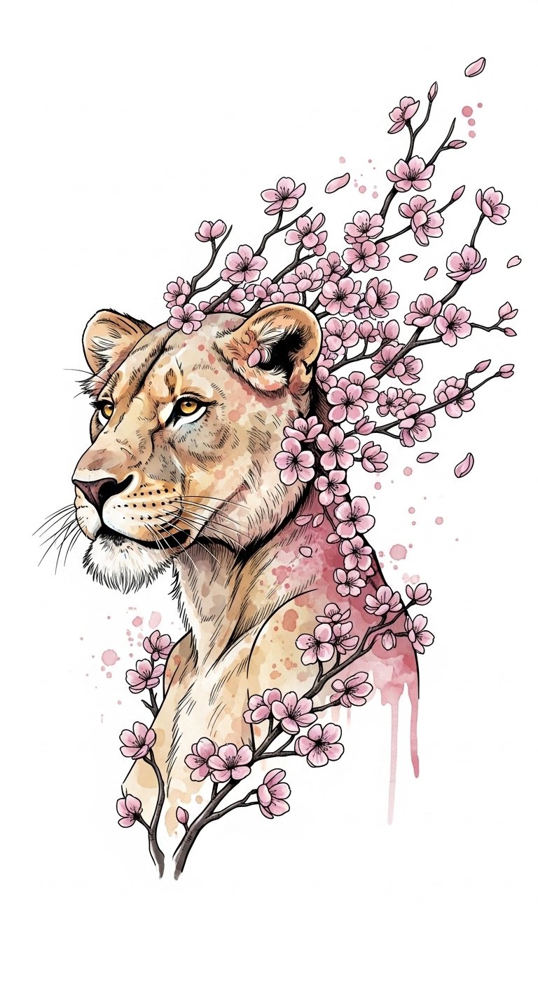 The fierce lioness embodies strength and grace, making her an enchanting counterpart to the delicate cherry blossoms that symbolize renewal and the fleeting nature of beauty.