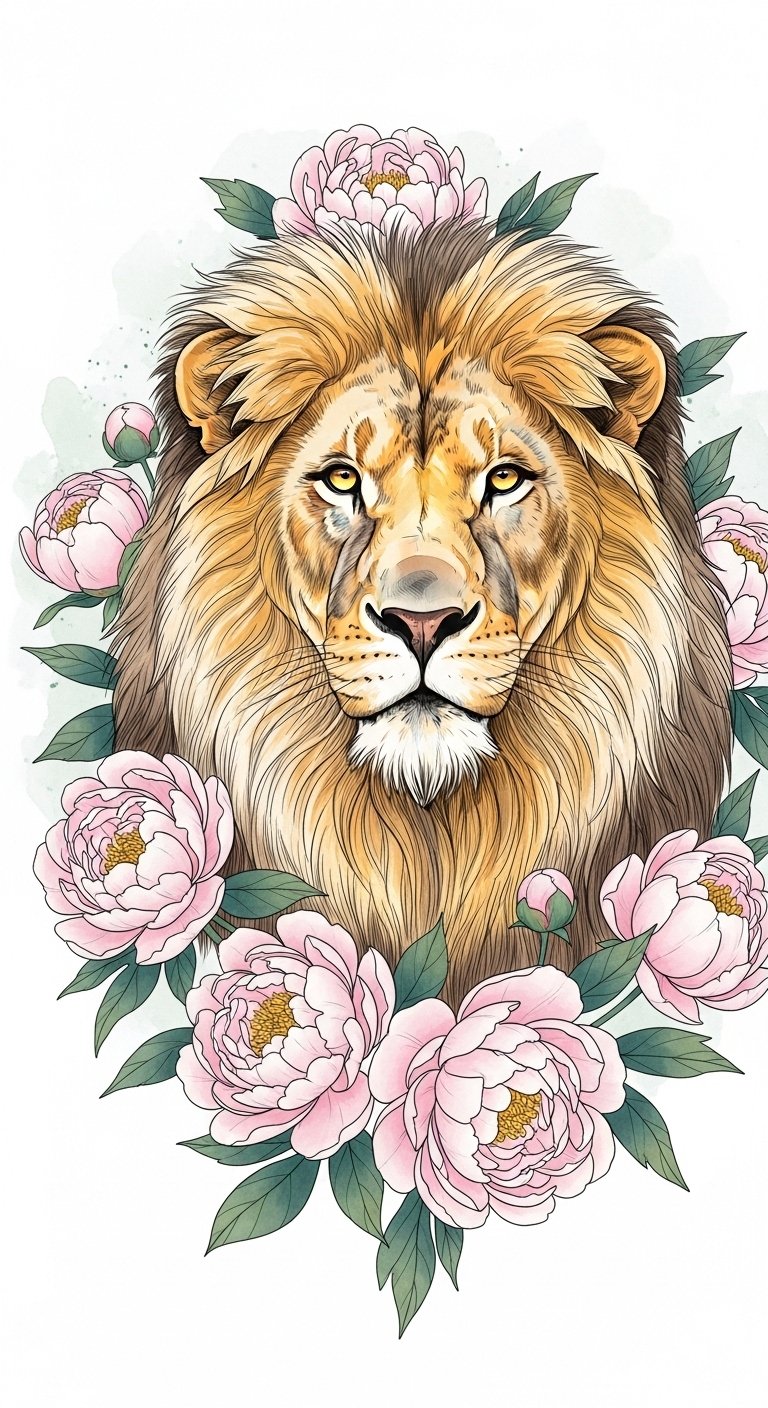 The grayscale lion with floral shadows symbolizes the interplay of strength and vulnerability: the lion’s intense gaze anchors feelings of courage and protection, while the soft floral motifs express resilience, renewal, and personal freedom.