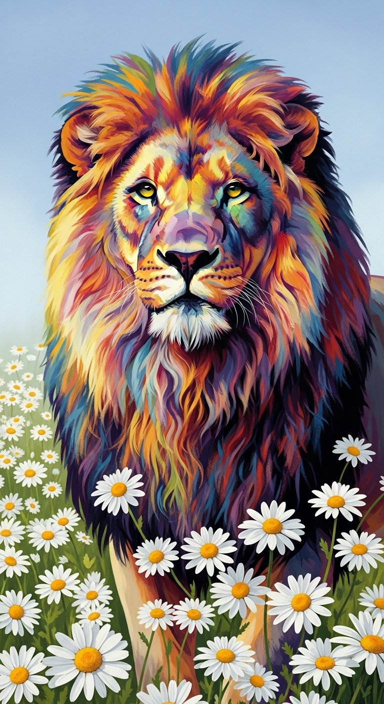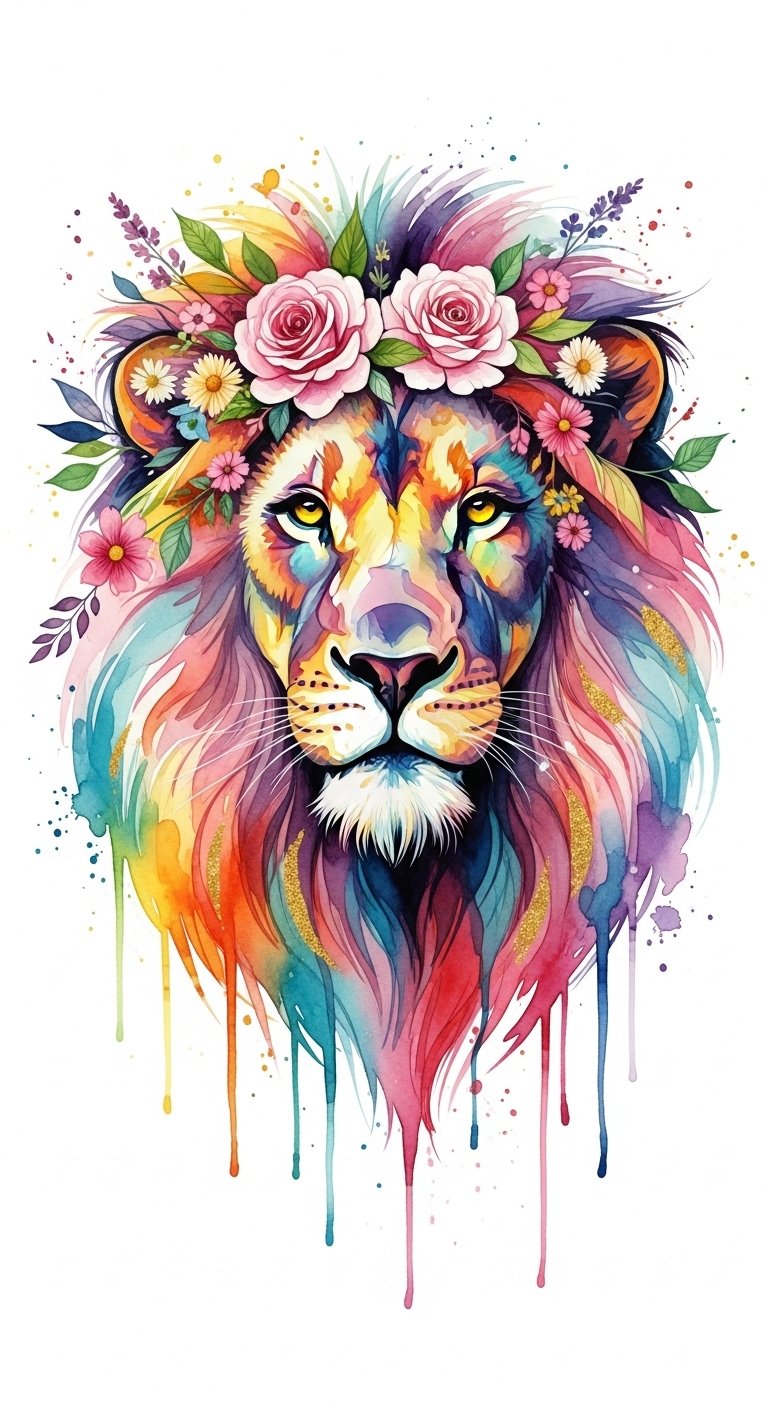 The lion entwined with mixed flowers symbolizes the balance of strength and vulnerability, courage softened by beauty; the vibrant palette evokes joy and resilience while each bloom can represent personal traits or milestones.