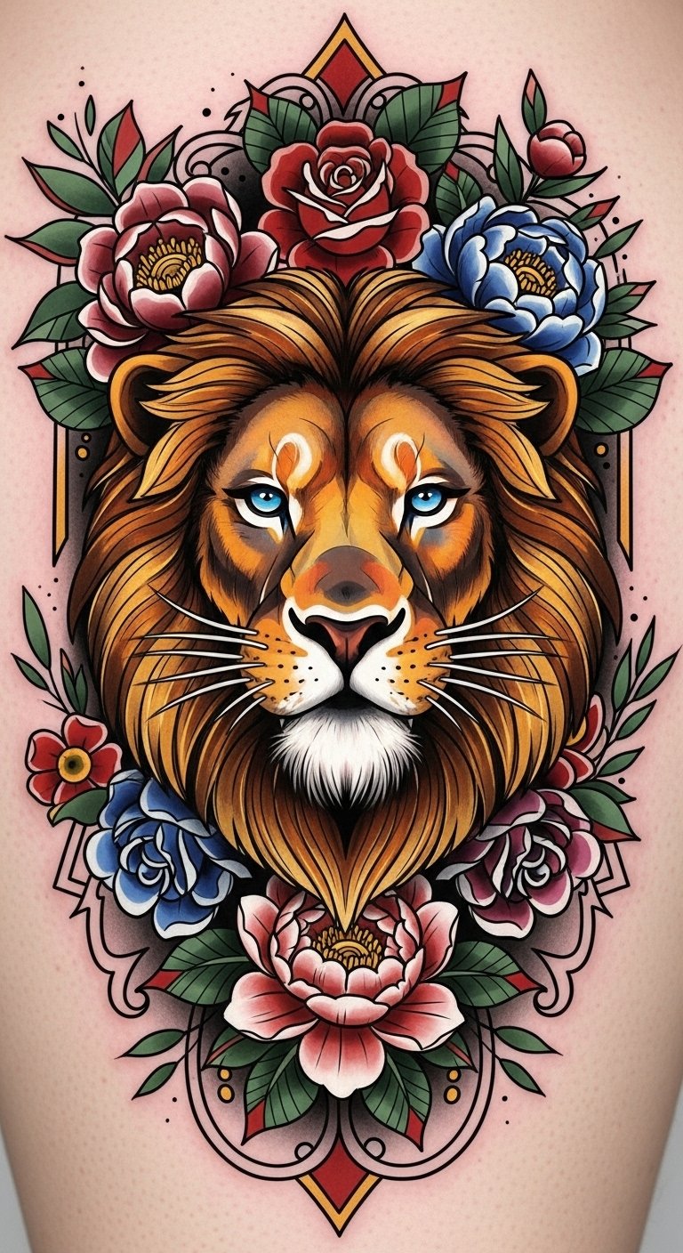 This design pairs the lion’s noble, watercolor-infused mane with bold neo-traditional outlines and stylized blossoms—suggesting a balance of raw strength and delicate grace.