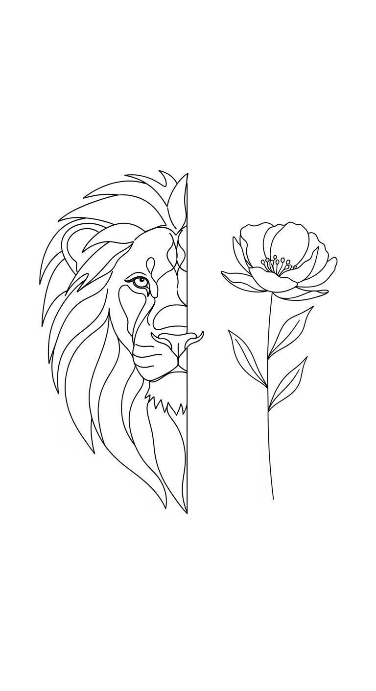This tattoo concept pairs a clean, single-line lion profile facing a delicate flower outline—thin black ink, negative space mane, subtle petal details—evoking quiet strength and gentle growth; place along the inner forearm or upper chest so its juxtaposition of courage and resilience reads intimately, conveying calm confidence and personal liberation through minimalist visual language.