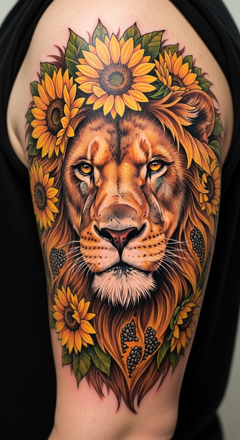 Consider placement on the upper arm, chest, or back for a composition that flows with muscle contours; use warm golden yellows and rich browns with fine realistic shading to convey both the lion’s majesty and the sunflowers’ uplifting warmth, evoking resilience, confidence, and hope.