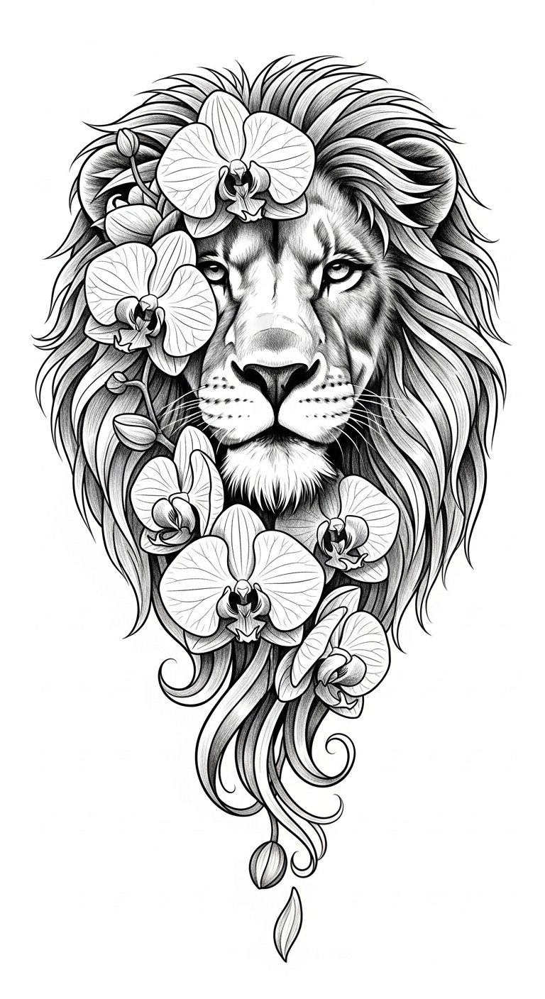 As the bold lines of a lion’s mane flow into fragile orchid petals, the design balances power and tenderness—strength rendered in sweeping, dynamic strokes that taper into fine, intricate floral details; the composition evokes protection and vulnerability, perfect for a shoulder blade or ribcage where movement accentuates the flow, or along the forearm for a linear narrative.