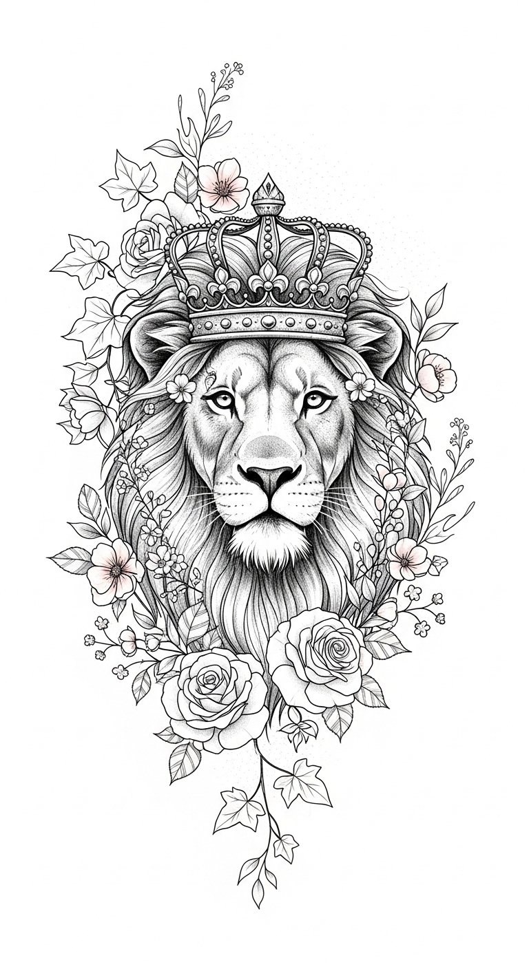 This design embodies regal symbolism, showcasing strength and courage while highlighting floral elegance through the delicate petals.