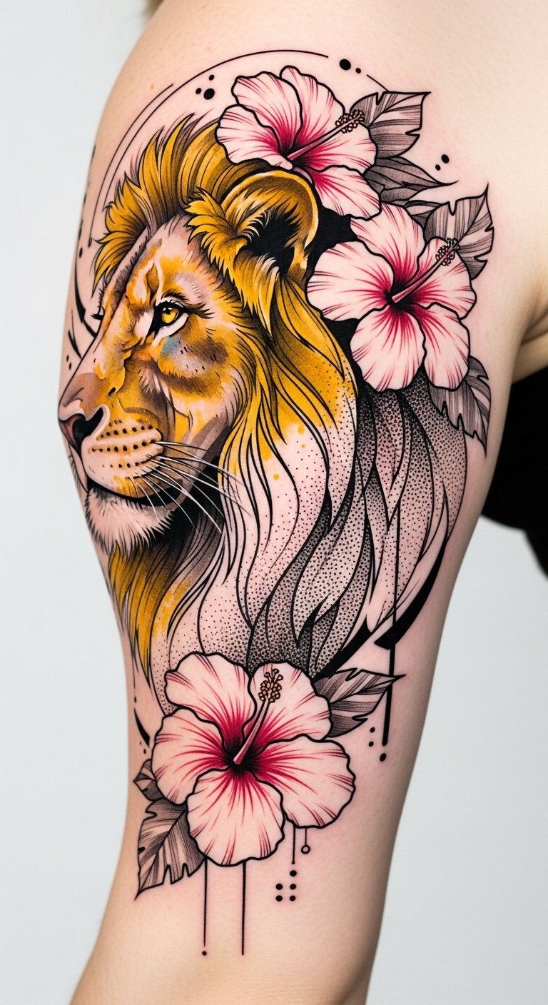 Building on the theme of blending strength with nature, the harmonious lion and hibiscus tattoo embodies a vibrant fusion of power and beauty.