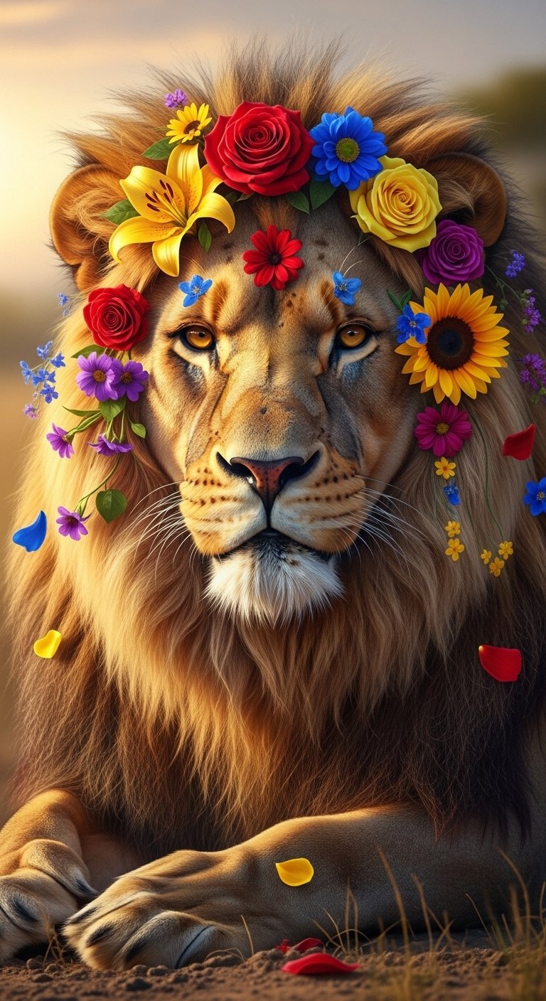 Imagine delicate petals entwined around its majestic mane, creating a harmonious blend of nature and power.