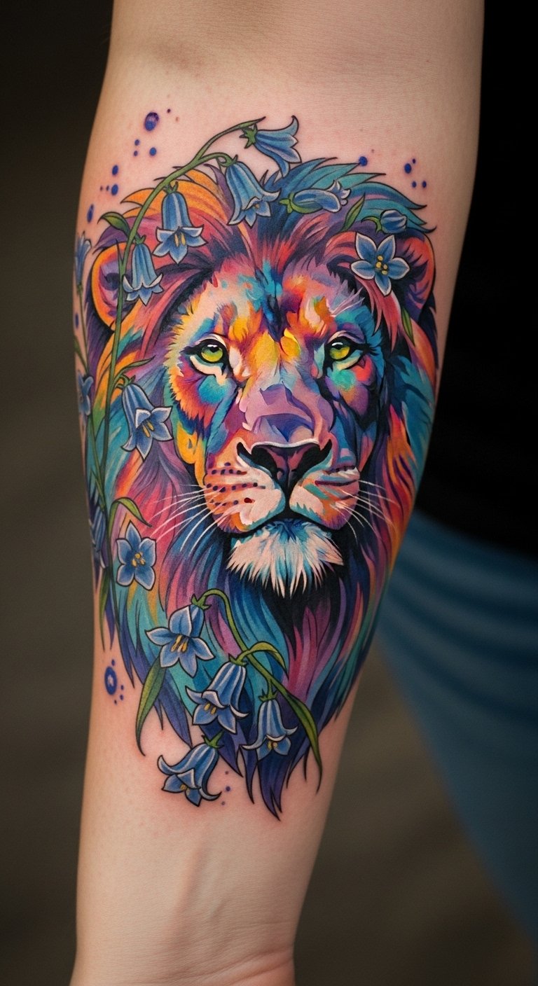 The design fuses regal strength and gentle grace: a vividly colored lion’s head framed by cascading bluebell blossoms, with saturated warm tones in the mane balanced by cool blue accents.