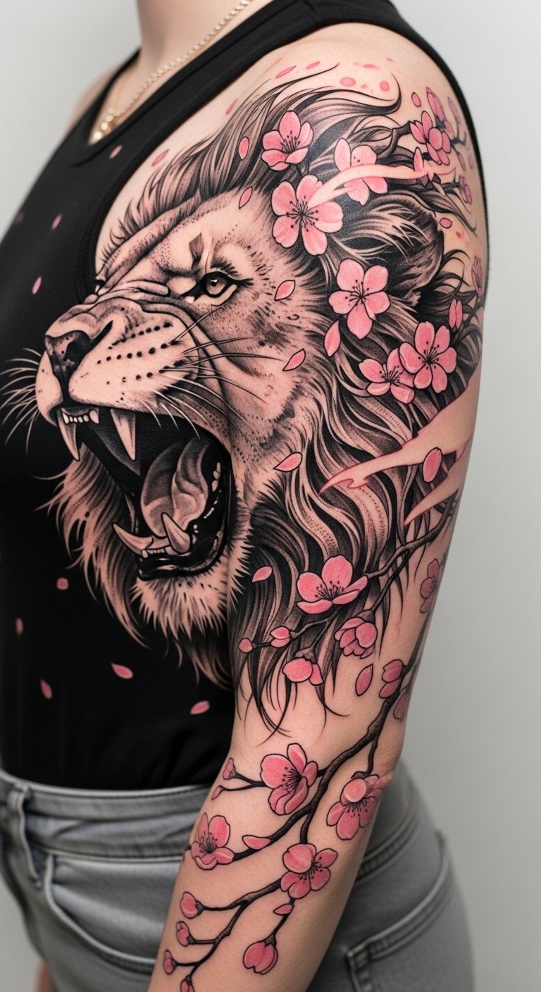 Place the tattoo as a flowing sleeve from shoulder to mid-forearm or as a large back piece curving over the shoulder blade so the lion’s gaze follows the body’s movement; the interplay of bold mane and soft petals evokes resilience and tenderness, suitable for someone honoring personal strength and impermanence.