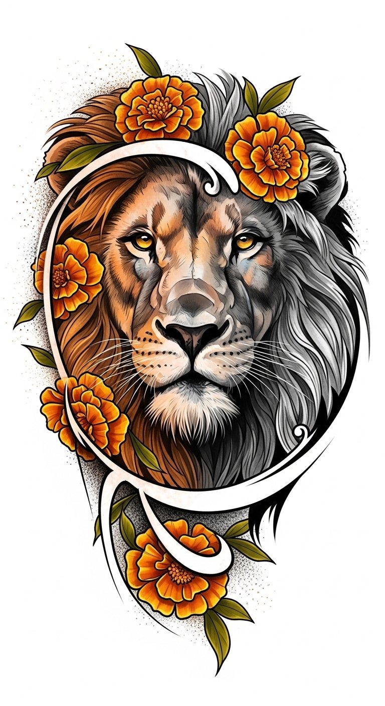 This detailed illustration showcases the lion’s fierce gaze intertwined with marigold blooms, symbolizing resilience and positivity.