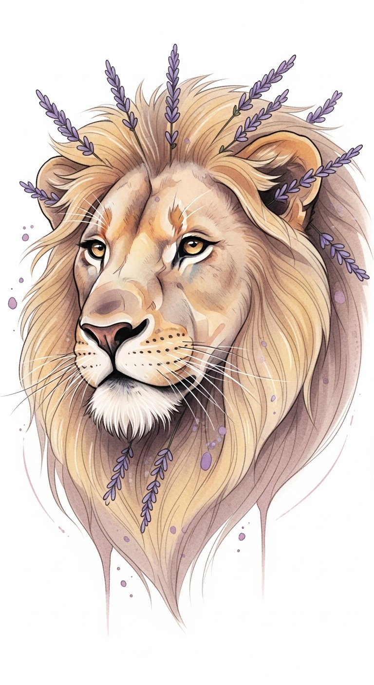 A gentle lion adorned with lavender accents offers a serene yet enchanting tattoo design that perfectly balances strength and tranquility. The lavender symbolism represents calmness and grace, making this tattoo not only visually stunning but also deeply meaningful.