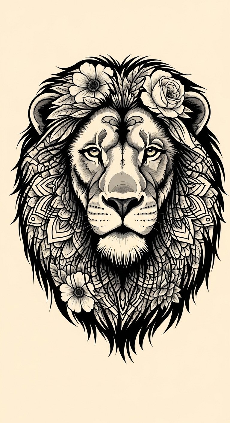 Imagine a tribal lion merging seamlessly with vibrant flower patterns, symbolizing resilience and beauty.