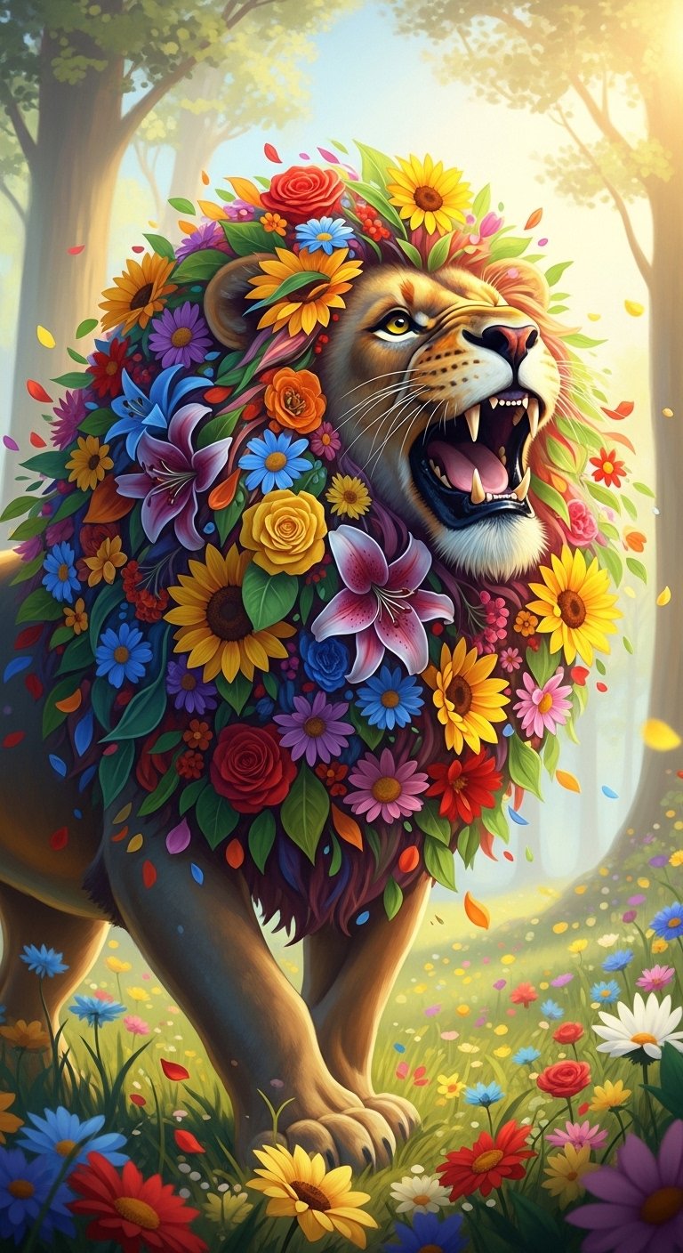 Symbolically it merges courage and vulnerability, the lion representing inner strength and the flowers representing growth, renewal, and beauty; emotionally it evokes pride tempered by tenderness.