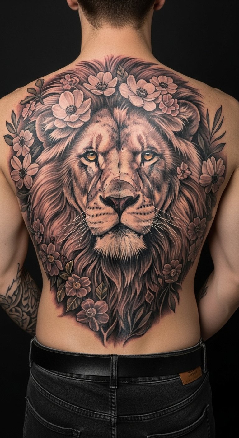 Expanding the enchanting concept into a large back piece turns the composition into a bold statement across the canvas of the back: the lion’s half-face centers on the spine, mane flowing outward into branches of blossoms that curve with the shoulder blades and ribcage, balancing raw power and soft petals.