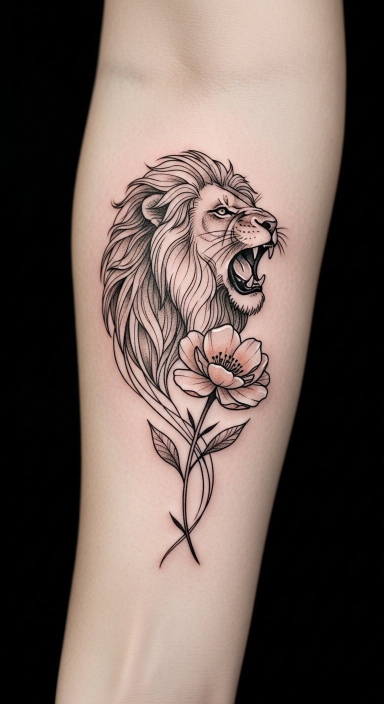 A small forearm tattoo featuring a lion and a flower can be a powerful yet intimate piece of body art.