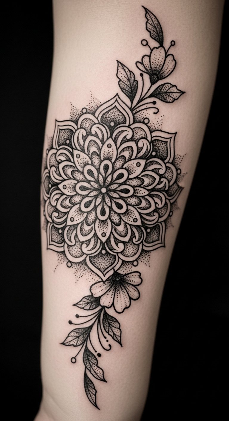 Embrace the freedom of art on your skin! This design symbolizes balance and growth—the mandala center grounding intention while the floral vine signifies personal evolution; the stippling technique evokes patience and precision, inviting quiet contemplation.