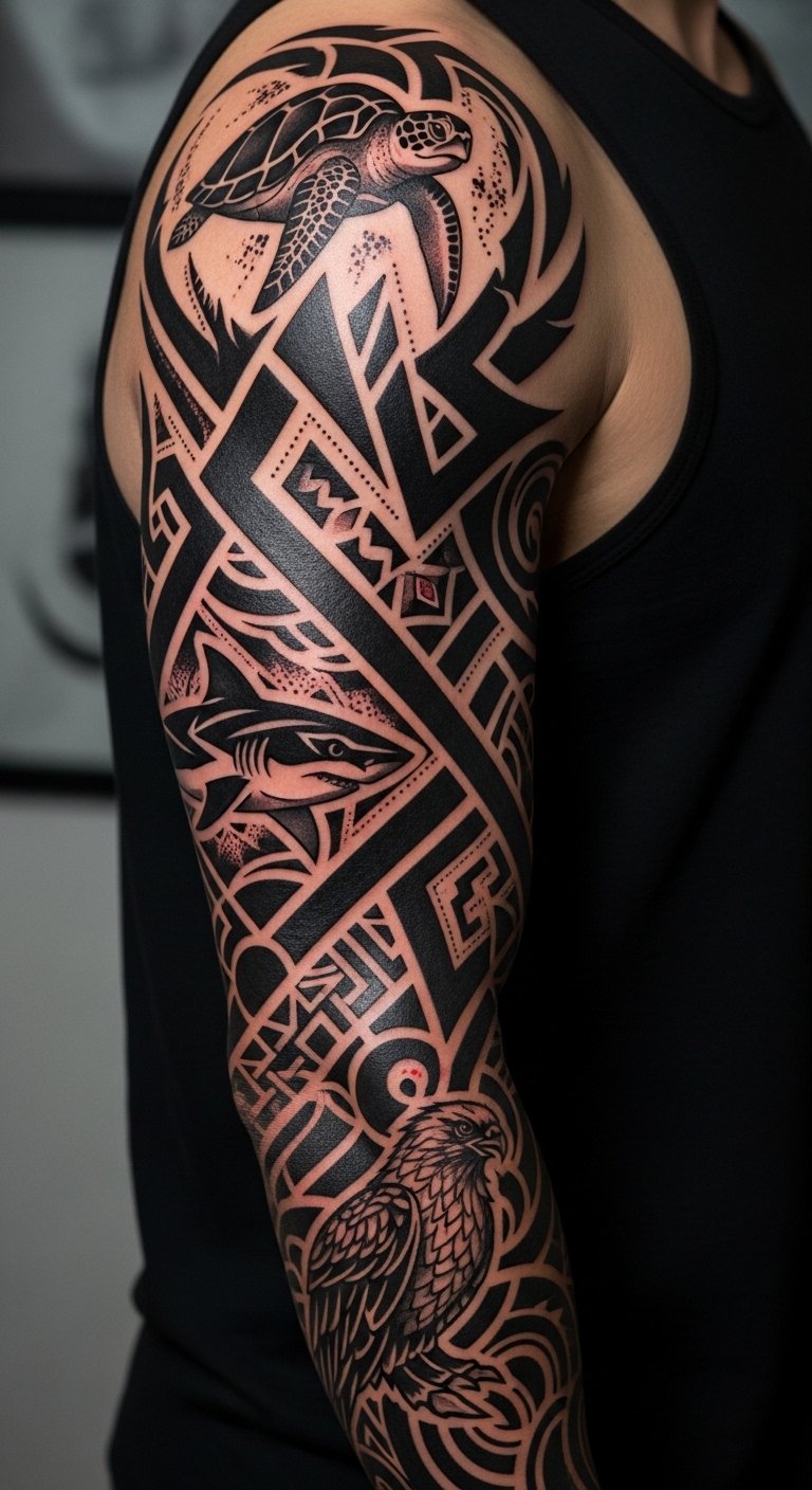 This sleeve concept blends ancestral symbols to evoke protection (turtle), strength (shark), and freedom (bird), using flowing lines to create motion and dotwork to add ritual texture; emotionally it offers reverence and personal empowerment, best placed wrapping the upper arm and forearm so each element aligns with natural muscle flow and is visible both in motion and at rest.
