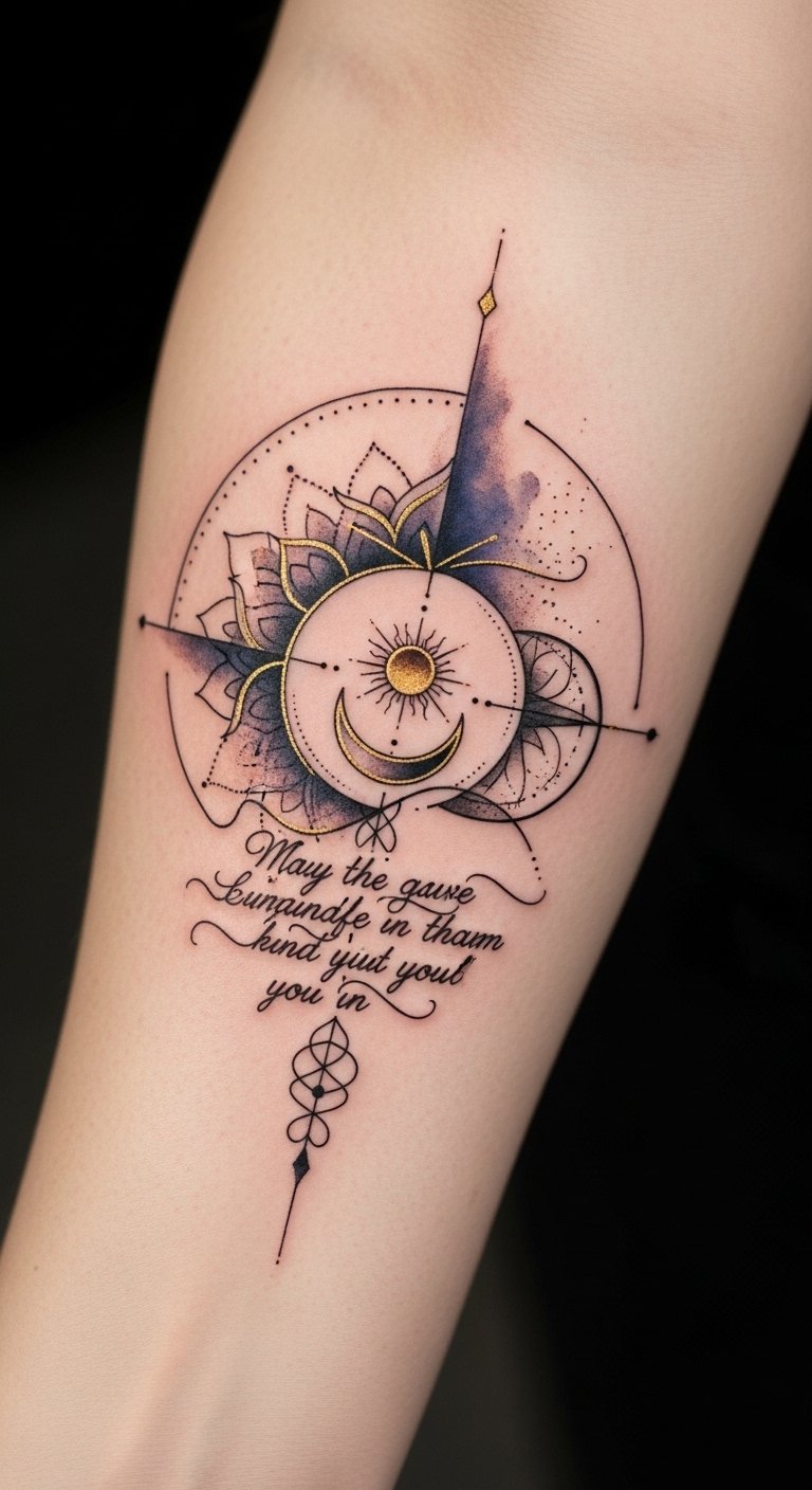 The design combines the mandala’s centered harmony and the compass’s directional certainty to symbolize inner balance and guided purpose; the sun and crescent invoke cycles and renewal while the scripted mantra personalizes intent, evoking calm courage and continual growth.