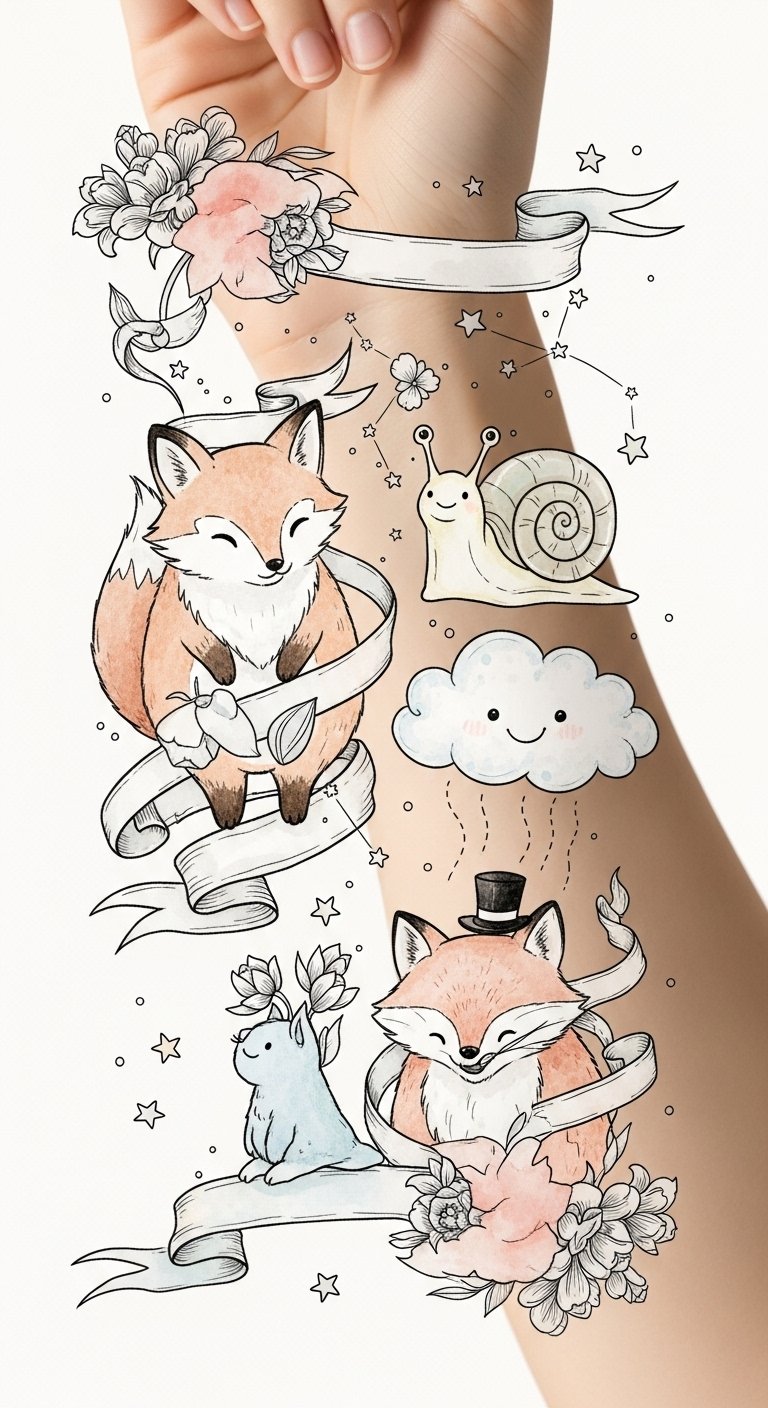 Each element symbolizes a facet of lighthearted individuality: the chubby fox for curiosity and clever warmth, the dapper snail for slow joy and charming patience, the smiling cloud for carefree optimism, and the floral constellations for connected personal stories.