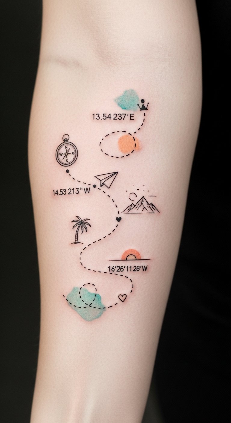 Ideal placement along the inner forearm, ribcage, or collarbone allows the piece to be revealed selectively, reflecting how travel memories are both private and proudly carried.