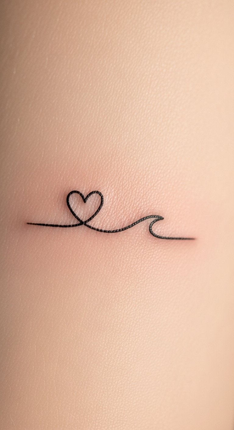 The combined heart-and-wave motif symbolizes love and emotional flow, evoking calm resilience and gentle movement; emotionally it feels intimate and empowering, suited for wrist, behind-ear, ankle, or inner finger placement where it reads as a small private talisman.