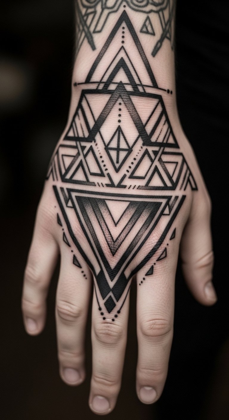 Triangles in this design symbolize balance, freedom, and personal narrative—sharp, interlocking forms evoke strength and direction while subtle negative space and fine dotwork soften the geometry with a contemplative mood.