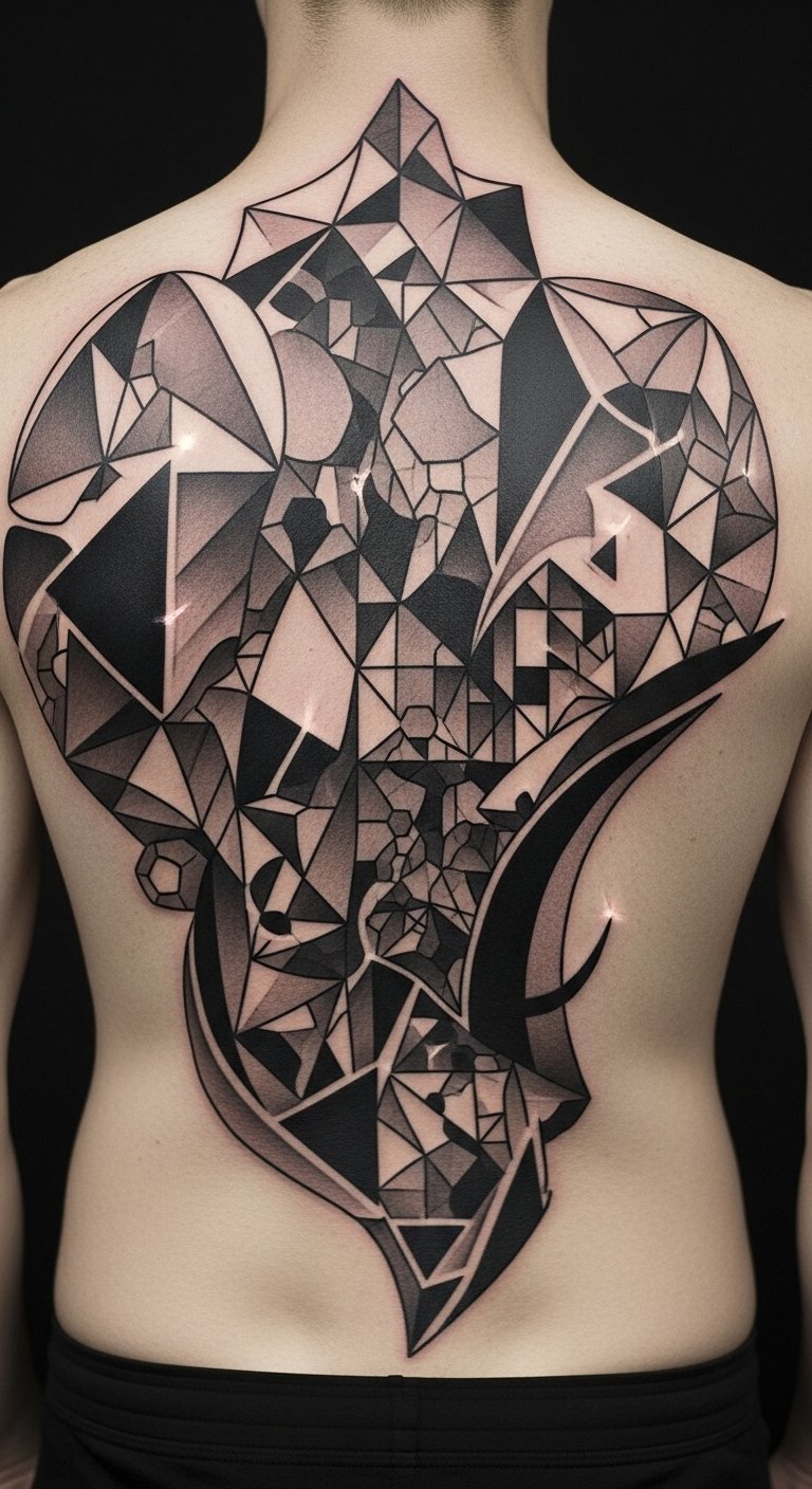 These abstract polygon tattoo concepts symbolize the balance between order and spontaneity, blending crisp lines and intersecting planes to evoke resilience and individuality.