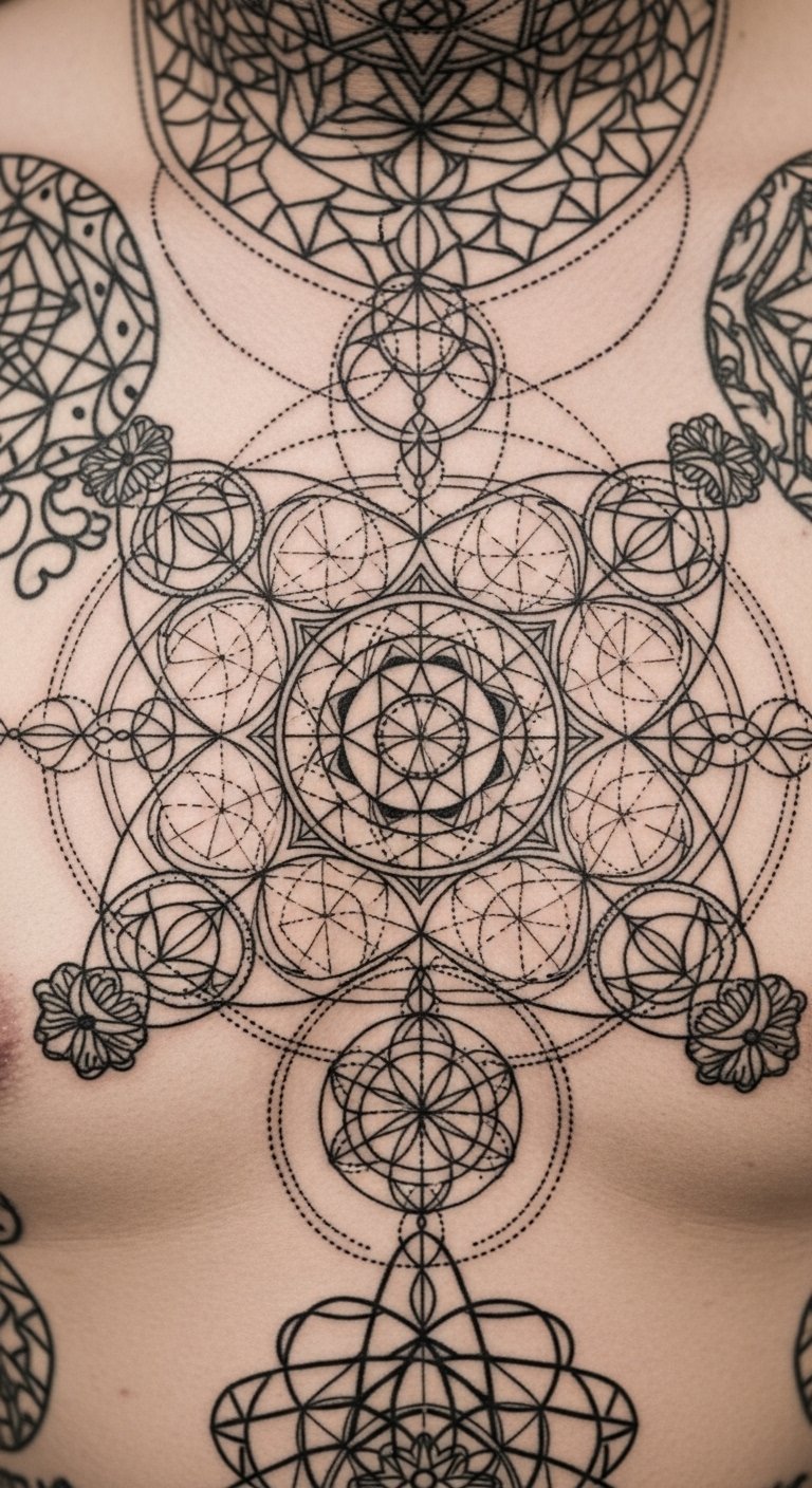 A radial mandala centered on the sternum or upper back, composed of interlocking seed-of-life and flower-of-life patterns with precise dotwork and thin-line geometry; incorporate a subtle golden ratio spiral overlay and tiny constellations between petals, high-contrast black ink with selective muted gold highlights. This piece symbolizes unity, balance, and the intersection of mathematics and spirit — it evokes calm curiosity and a sense of belonging to something larger. Ideal placements are over the heart, along the spine, or spanning the shoulder blade to align with breath and movement, enhancing both visual flow and personal resonance.