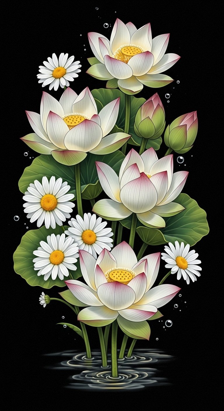 This design symbolizes emergence from difficulty (lotus) paired with fresh starts and simplicity (daisies), intended to evoke calm resilience and hopeful renewal; ideal placements include inner forearm, upper shoulder, or ribcage where the composition can read both intimately and expansively.