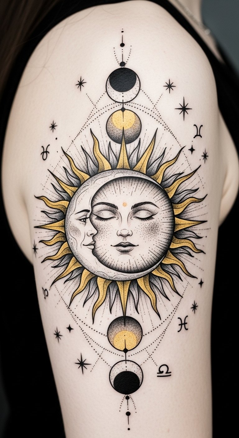 These celestial motifs embody cosmic harmony, reflecting the dance of lunar phases and solar rays. Adorning your skin with astrological symbols amidst starry skies captures the essence of celestial balance, making each tattoo a vibrant reminder of your connection to the universe.