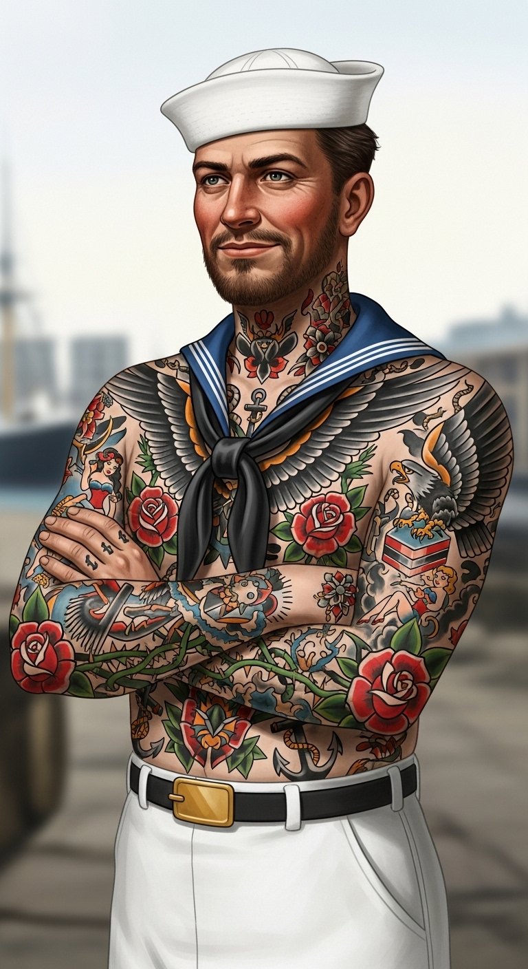 The vintage sailor represents adventure and resilience; the eagle communicates freedom and pride; roses add beauty, passion, and remembrance.