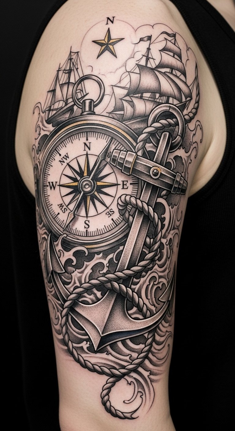 Place the design where it can flow with the body’s lines—along the forearm for visibility and storytelling, the upper arm for a bold statement, or the chest over the heart to emphasize personal meaning; the combined elements balance movement and stillness, symbolizing voyage, change, and stoic acceptance.