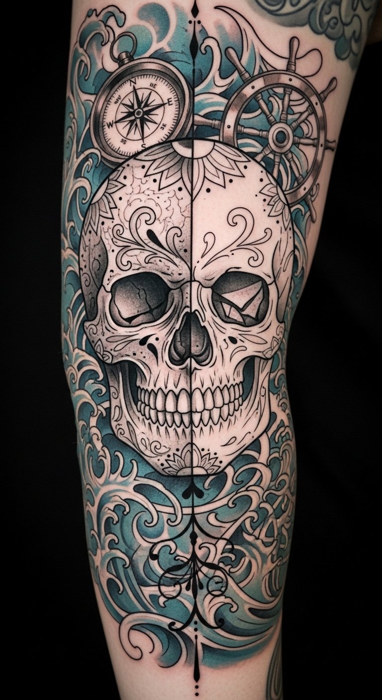 While nautical imagery speaks to adventure and exploration, skulls offer a contrasting perspective, embodying themes of mortality, transformation, and the acceptance of life’s fleeting nature.