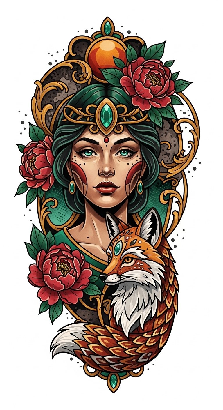 This design symbolizes personal transformation and resilience—peonies for honor and beauty, the fox for cleverness and adaptability, and the jewel tones for inner richness and vitality; its bold lines and ornamental details convey confidence and permanence while the portrait evokes intimate identity, making it ideal for a visible placement like the upper arm or chest where it can wrap naturally with the body’s contours and be shown or covered as desired.