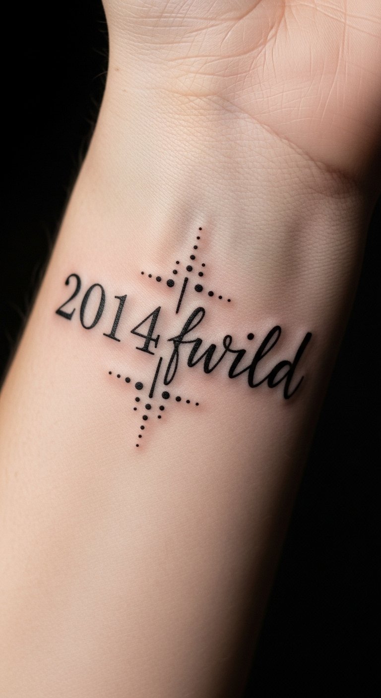 Place on the inner wrist or along the ribcage for intimate visibility; the year anchors memory while the word conveys emotion, the contrast of serif numerals and hand-lettered script balancing formality and personal expression, with dotwork accents adding subtle texture and a timeless, understated elegance.