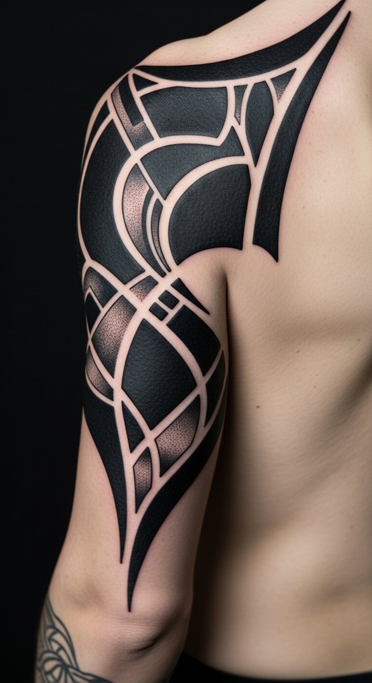 This design pairs stark geometric blocks and sinuous organic lines to symbolize balance between structure and spontaneity; emotionally it conveys confidence and introspective energy, suitable for placement along the forearm where movement animates the composition or across the upper back to read as a bold, centered statement that interacts with the body’s natural lines.