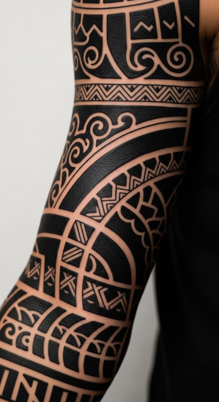This design concept translates the original words into a flowing upper-arm half-sleeve: bold black interlacing lines form a central ancestral spiral representing stories of ancestors, framed by repeating chevrons for strength and smaller finger-like tendrils symbolizing freedom and identity. The emotional tone is reverent and empowering, intended to evoke connection, pride, and continuity with tradition. Best placed on the outer bicep wrapping partially toward the shoulder to allow visibility and adaptability, the piece can be scaled or mirrored to suit personal heritage and body shape.