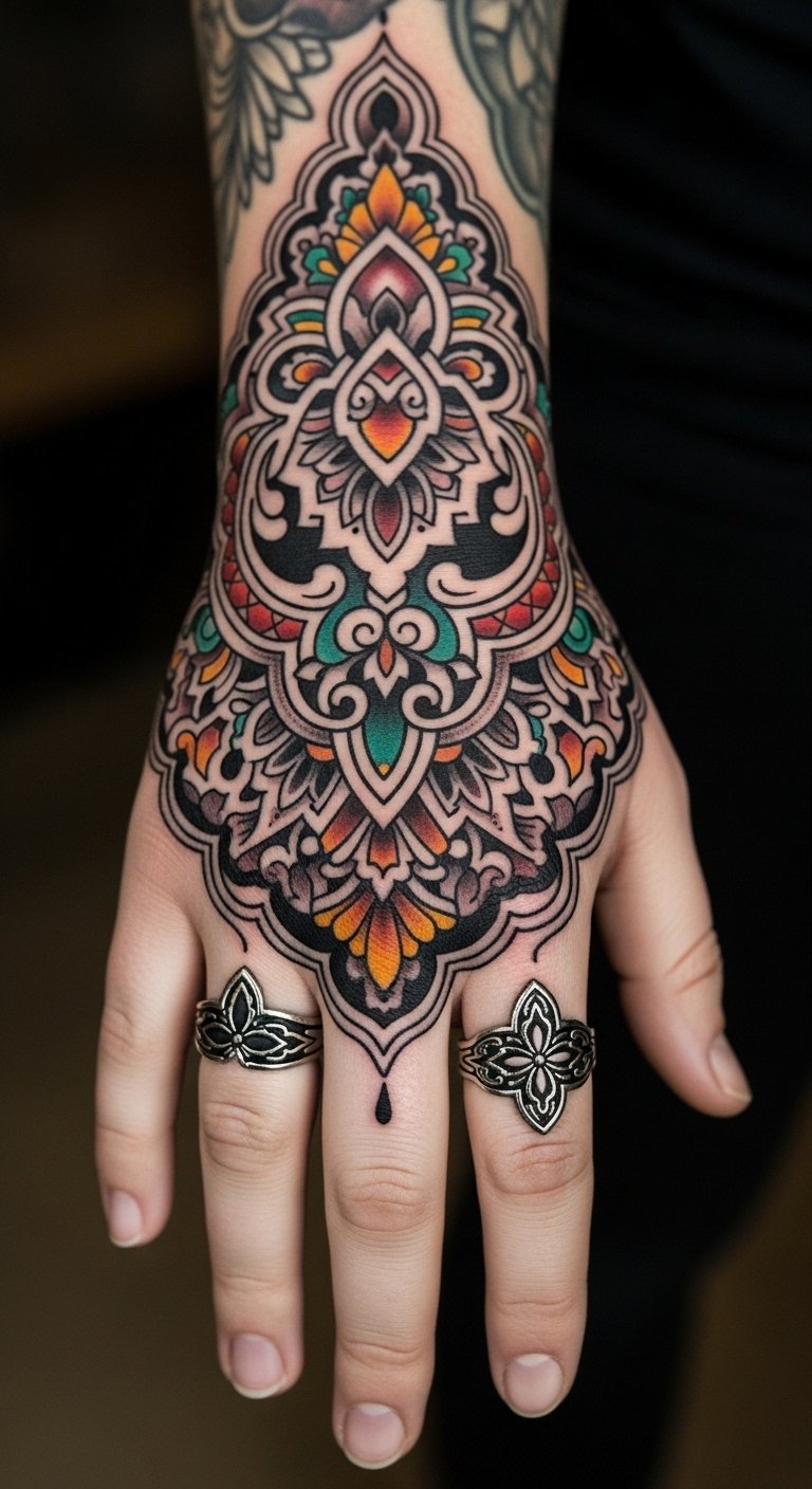 After appreciating the delicate artistry of decorative ring-style tattoos, you might find yourself drawn to the bold allure of full-hand masterpieces.