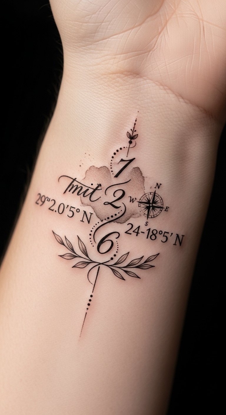 The design pairs precise numerals and coordinates with a tiny compass rose to convey guidance and orientation, the sepia wash suggesting nostalgia and warmth, and the botanical sprig representing growth and continuity; ideal for inner wrist, behind the ear, or along the collarbone where intimacy and visibility balance, evoking quiet emotion and lifelong remembrance.